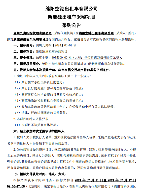 綿陽空港出租車有限公司新能源出租車采購項(xiàng)目采購公告
