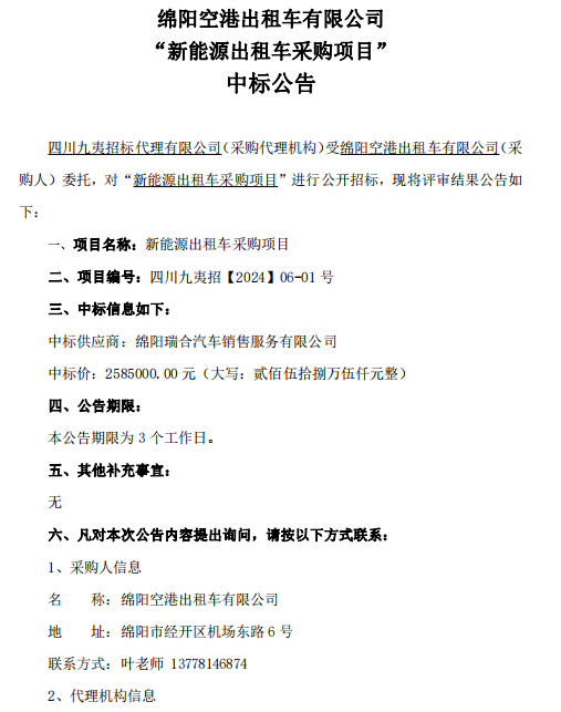 綿陽(yáng)空港出租車(chē)有限公司 “新能源出租車(chē)采購(gòu)項(xiàng)目” 中標(biāo)公告